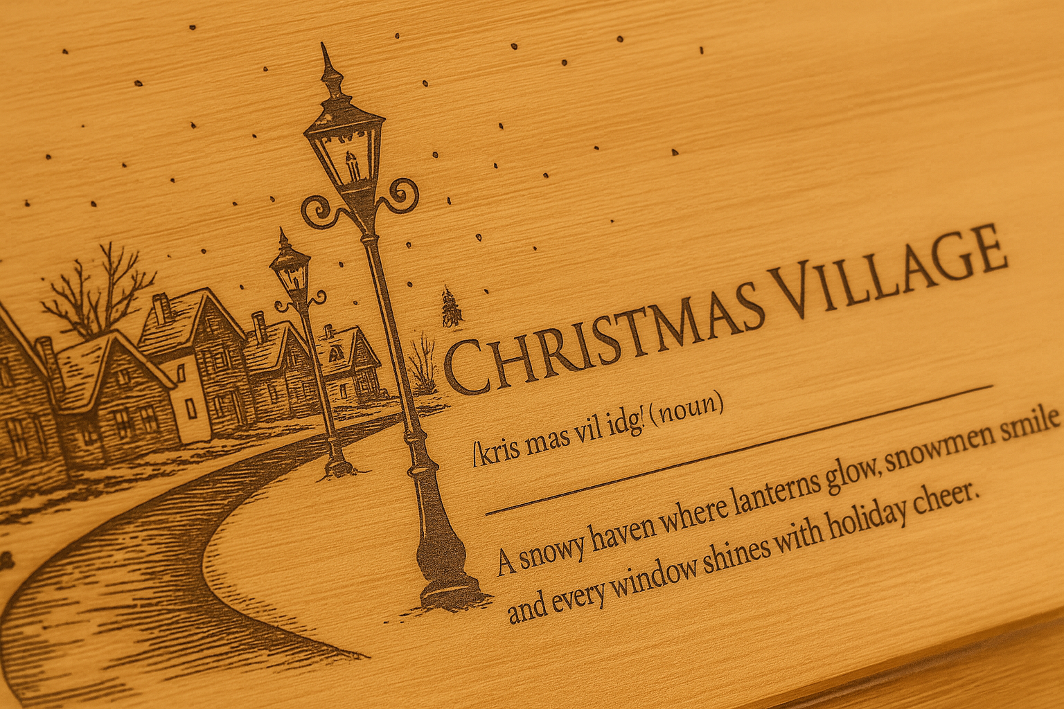 A charming Christmas Village engraved bamboo serving board featuring snowy rooftops, festive homes, and a cosy winter feel.