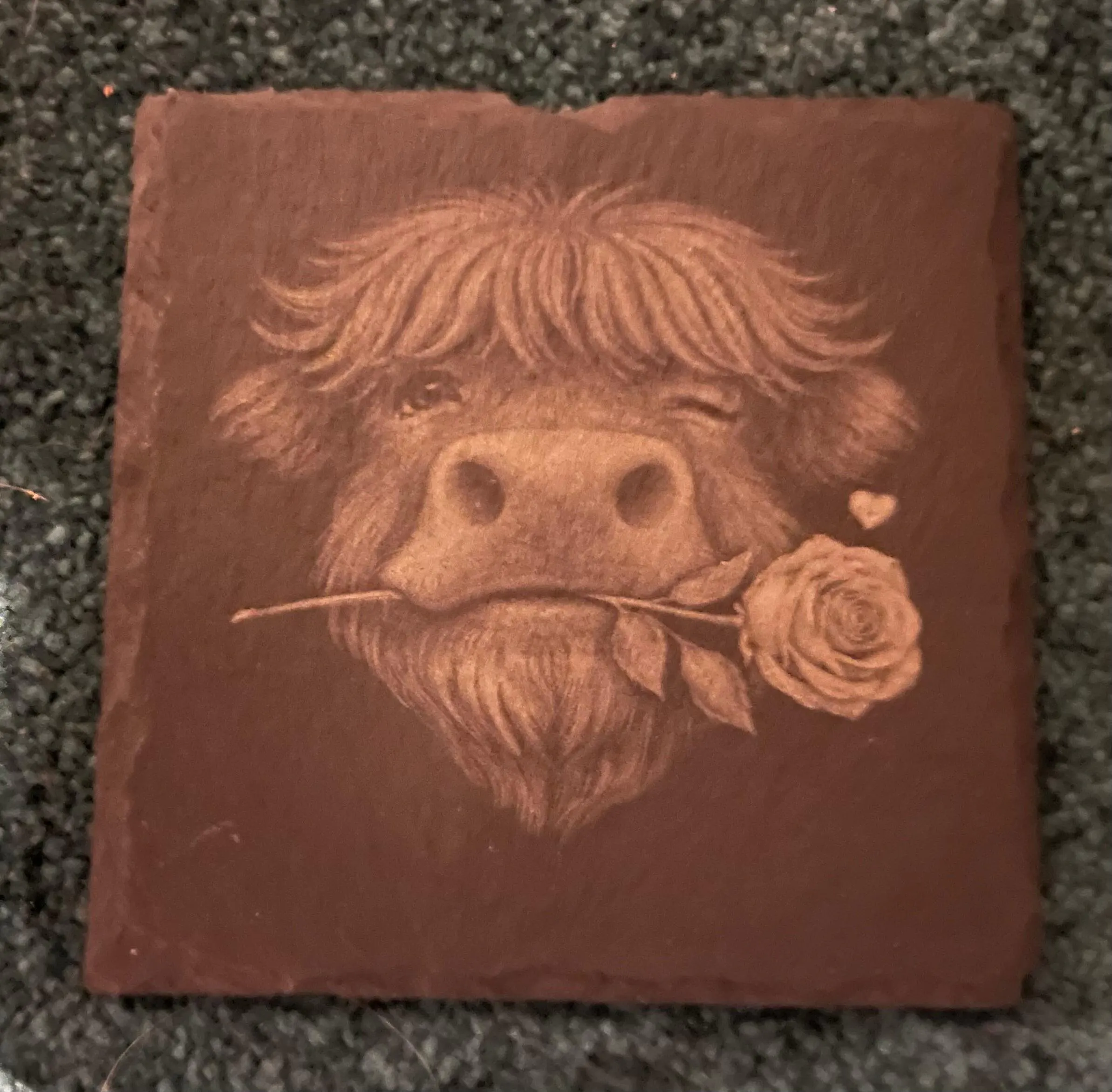 Turn any moment into a romantic gesture with this beautifully engraved Highland Cow With Rose slate coaster. Featuring a winking Highland cow holding a single rose, this design brings warmth, character, and a touch of Scottish charm to any home.