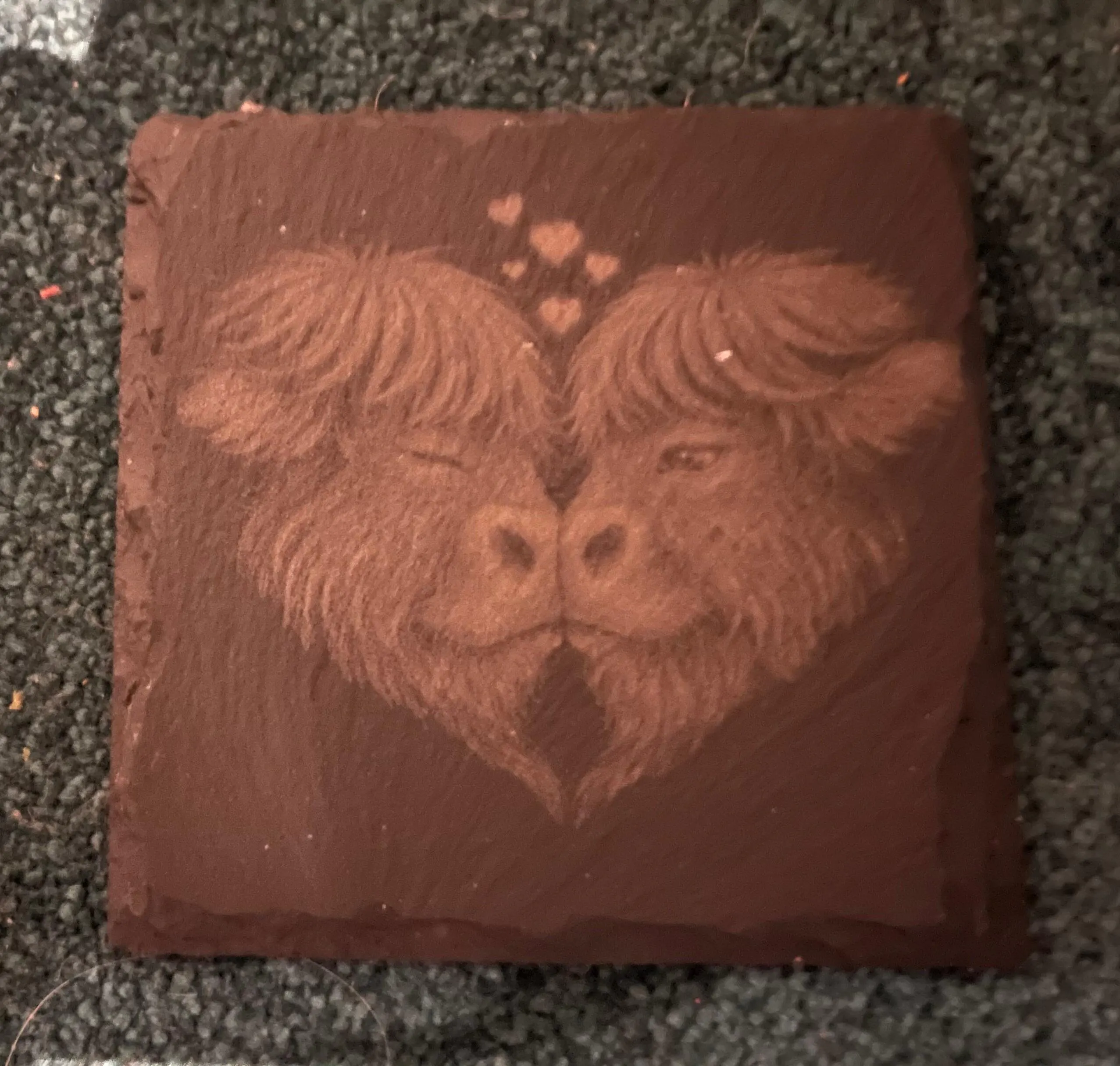 Each coaster is engraved on 100×100 mm natural black slate and finished with a light coat of butcher block conditioner to enrich the slate’s natural colour and make the engraving pop with a crisp silver contrast. A perfect gift for Valentine’s Day, anniversaries, weddings, or anyone who loves Highland cows.